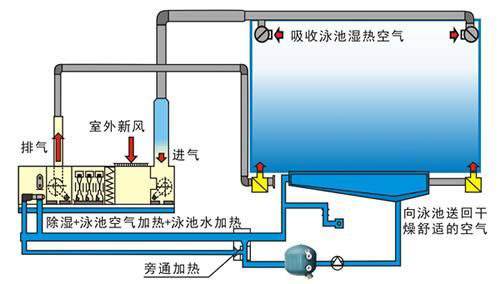 (3)泳池水加熱,熱泵除濕時回收的大量熱量絕大部分時候都能滿足游泳池水的恒溫要求,所以一般不需要輔助泳池水加熱器運行。