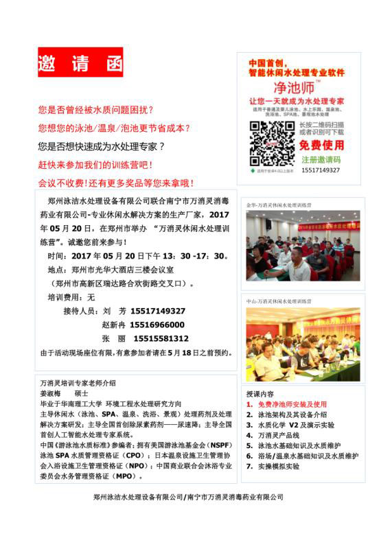 鄭州泳潔水處理設備有限公司聯合南寧萬消靈消毒藥業有限公司-專業休閑水解決方案的生產廠家,2017年05月20日(這周六),在鄭州市舉辦“萬消靈休閑水處理訓練營”,誠邀您前來參與!