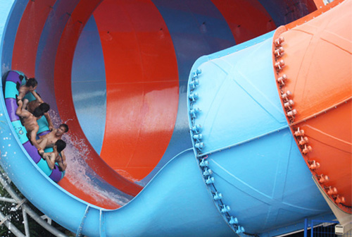 巨蟒滑梯:游客乘著最多一次可以容納6個人的圓形皮筏浮墊從19米的高空出發,高速穿越一段六十多米的螺旋滑槽后,急速下降近十米俯沖至一條巨大封閉管道中,反復左沖右突和旋轉著,猶如身處憤怒的蟒蛇當中,努力去黑暗作斗爭,最終重見光明,回歸平靜的水中。帶給游客一種獨特的奮進的漂流體驗。由于體積龐大,形狀獨特壯觀可以作為大型水上樂園王牌賣點,標志性設施。另外此水滑梯接待能力非常強每小時最大接客量高達1080人,最大程度地縮短游客排隊時間,極大的吸引人氣。
