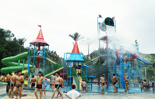 水寨以加勒比海盜為主題的大型互動(dòng)水上城堡,占地面積約1400平方米,高達(dá)14.5米,多項(xiàng)水上娛樂設(shè)施,兩個(gè)超級(jí)大翻桶。
